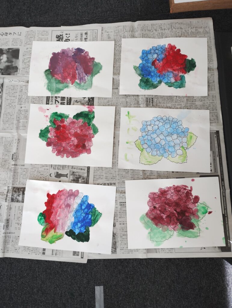6月 04 2025 ハーモニーの楽しい毎日 フィンガーペイント 昨日の活動は「描画」でした。 フィンガーペイントをやってみました。 アジサイの絵に絵の具で色付けしていきました。 筆は使わず、指で塗って行きました。 同じ材料でペイントしていきましたが、出来上がりの作品はこんなに違いました✨😊✨ みんな集中して頑張っていました。 ハーモニーの楽しい毎日 ルールのある遊び 感覚統合